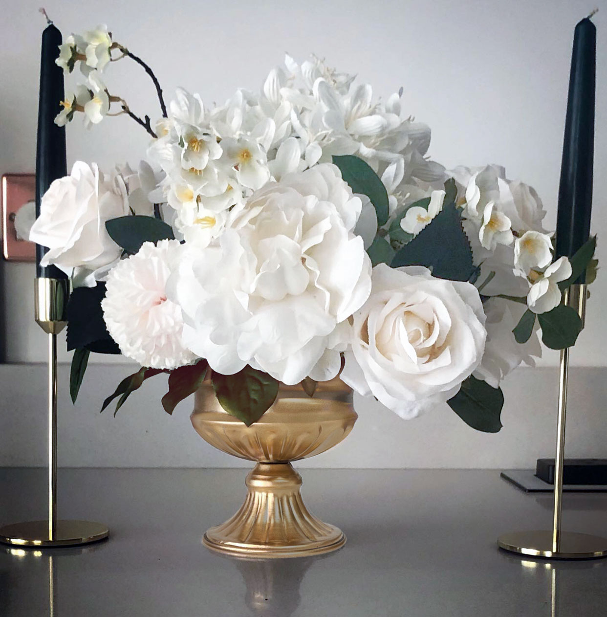 Faux flowers in small gold urn vase. Ready to use at your wedding, birthday or social event.