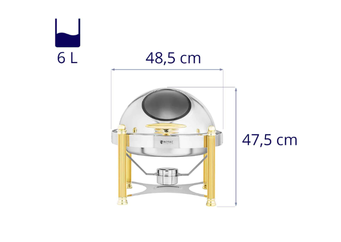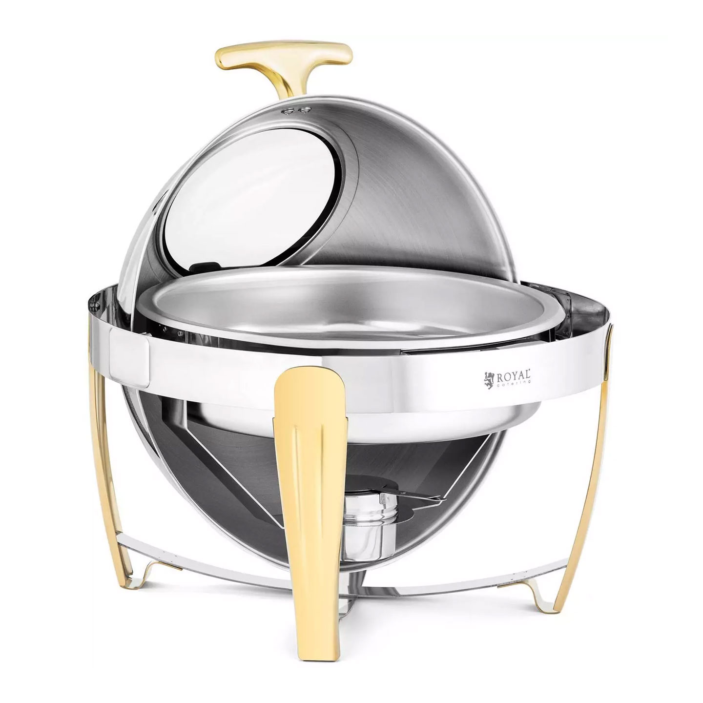Luxury Chafing Dish with glass window and decorative gold legs and handle. Includes 1 chafing fuel per dish.